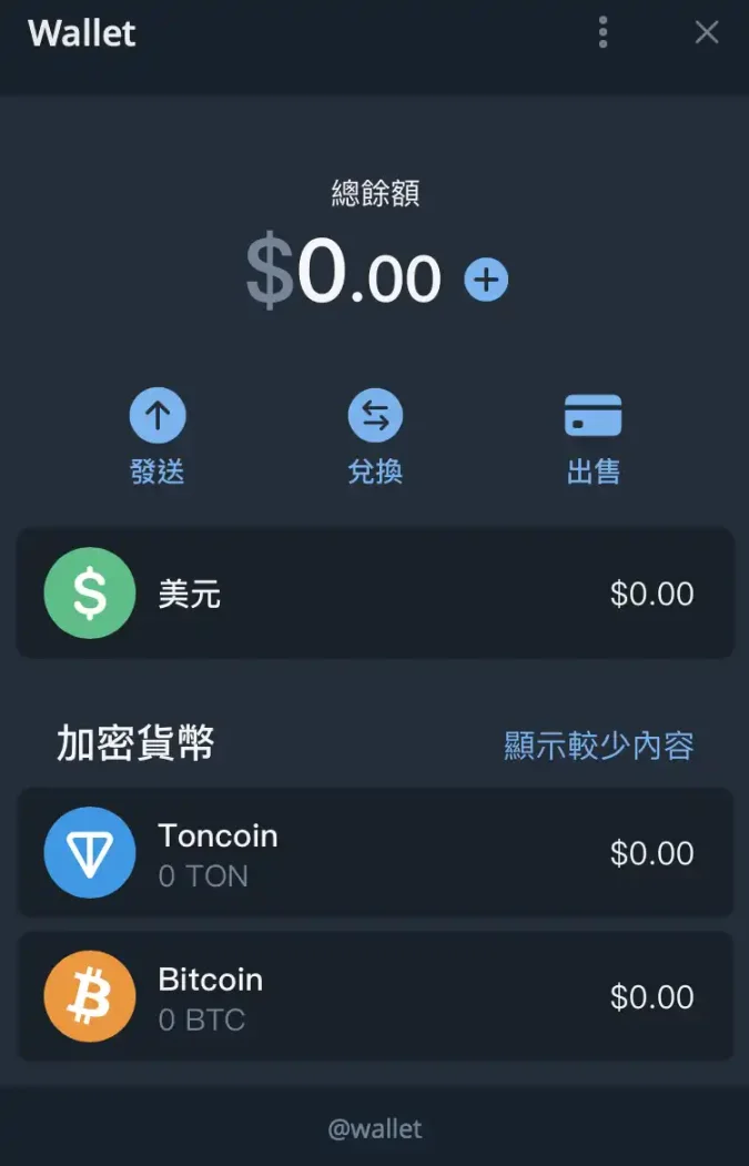 内置于 Telegram 的非托管钱包 Wallet(TON Space)在 2023 年 8 月份上线,目前支持 USDT、BTC 和 TON 三个币种。