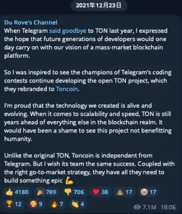 「我看到 Telegram 编程竞赛的冠军们在继续开发开源的 TON 项目,并将其品牌更新为 Toncoin 这一事很受鼓舞。