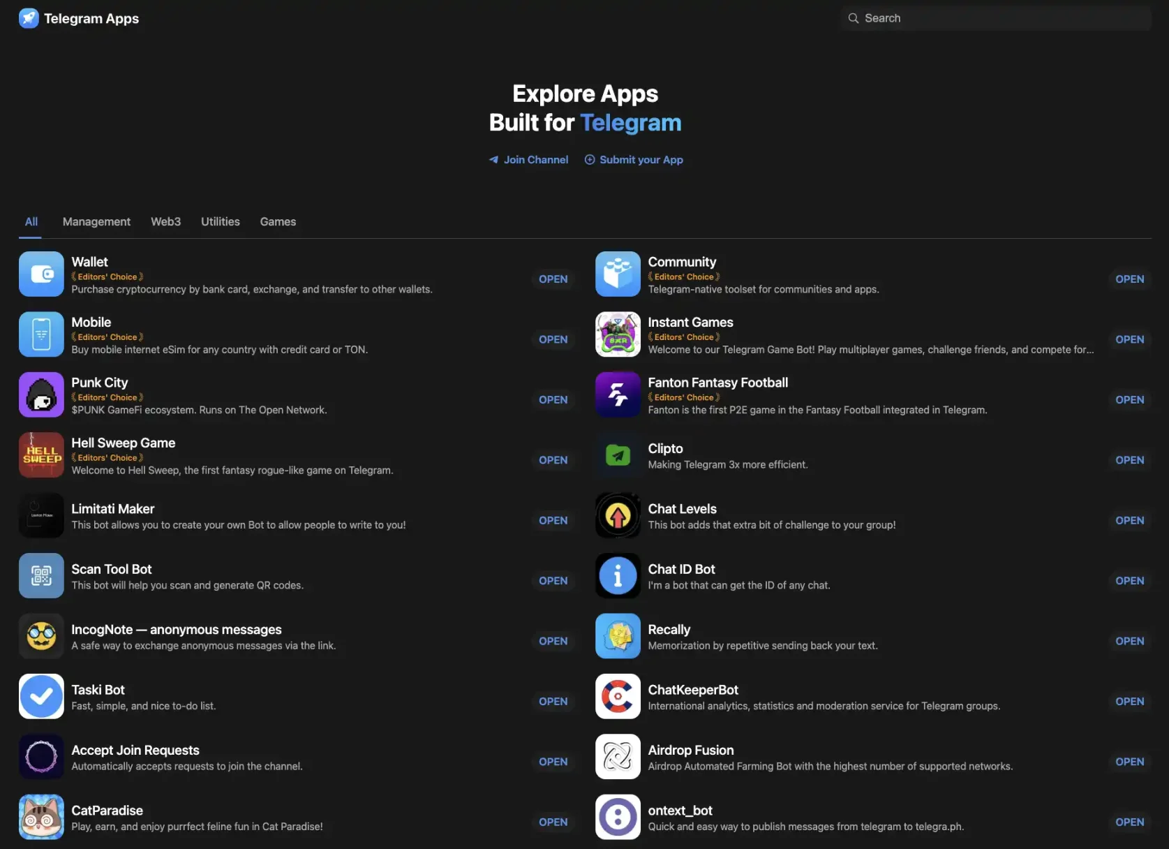 与 Telegram 关系紧密的 TON 基金会还在今年 8 月份上线了 Telegram Apps 应用中心,集成了 Telegram 当中各种各样的应用,从游戏、钱包到实用工具。