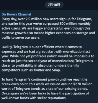 Telegram 从 2021 年开始一共接受了两次外部资金,第一次是在 2021 年 3 月,Pavel 宣布以出售债券的形式筹集了超过 10 亿美元。第二次是 2023 年 7 月,Pavel 宣布为了维持运营,Telegram 发行了 2.7 亿美金的债券,Pavel 本人购买了其中的 25%。在这次的信件中,Pavel 还透露了两个重要信息:Telegram 每日新增 250 万新用户;Pavel 本人不持有房产和私人飞机等富豪标配,只「拥有」Telegram、一些比特币和 Toncoin。