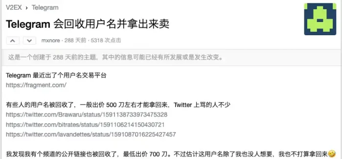 根据来自 Twitter 和 V2EX 用户的消息,Telegram 将长期未登录以及一些用公告频道的精品用户名进行了无预警的回收。一名被回收用户名的用户曾表示,「没有人愿意为 Telegram 用户名支付约 160 美元」。但他显然低估了加密行业的热情,已经有多个用户名以超 200 万美元的价格出售。