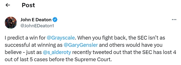 在灰度对SEC提起诉讼之后,Crypto领域的律师John Deaton是最早预测该公司会战胜SEC的专家之一。