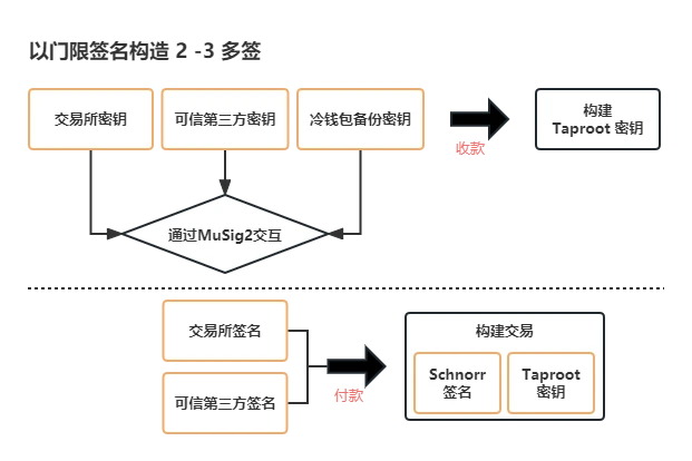 举例来说,对于交易所的热钱包而言,可以使用 2-3 多签方案,涉及三个私钥:交易所私钥、可信第三方私钥和冷钱包备份私钥。在门限签名中,多个签名者通过 MuSig 机制预先构建收款地址。在实际交易时,只需对两个签名进行聚合,即可完成交易。