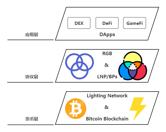 在比特币网络中,Schnorr 签名和 Taproot 等提案的逐步实施,以及以 LNP/BP 和 RGB 为核心的二层协议的不断成熟,为我们描绘出了一个令人兴奋的未来。在这个背景下,标准Web3的发展路径愈发清晰,构筑了一个建立在更为复杂的去中心化技术和密码学基础之上的全新格局。Infinitas 技术团队认为这种格局将以 LNP/BP 协议为基石,呈现出分层结构,类似于 TCP/IP 的架构,将货币层、协议层和应用层三个关键层次有机地融合在一起。