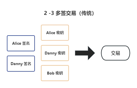 所以以一个 2-3 的多签交易来看,原来的传统方式是需要三个公钥加上两个签名才可以发起交易。