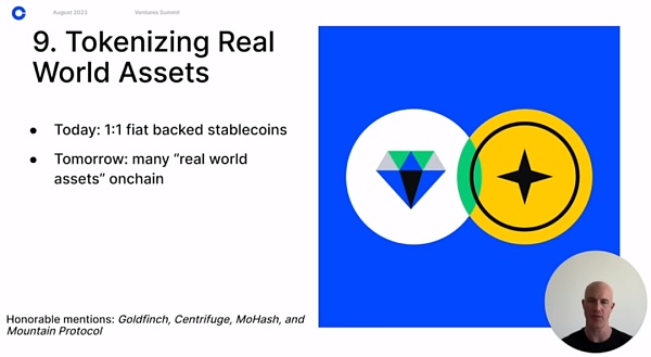 像USDC这样以1:1的比例支持的法定货币稳定币是最早的在链上实现的"现实世界资产"。我们相信随着时间的推移,许多形式的资产可以和将会在开放的、无许可的区块链网络上实现,从而创造出新的 具备编程能力、可组合性、全球24/7流动性以及信任最小化结算等特点的金融基础设施 。许多项目(包括我们投资组合中的一些公司)正在致力于在此领域探索方法,涉及债券、国库券、大宗商品、应收账款,甚至高端奢侈品等。