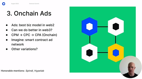 在Web 3中,也许我们探索 只在用户在链上购买或采取行动时才付费(CPA) 。想象一下,如果任何智能合约都可以公开一些关于愿意支付费用来引导用户执行函数调用的元数据。该函数调用可以接受推荐人的地址,并支付设定的佣金。索引所有支持此广告标准的智能合约将创造广告库存。
