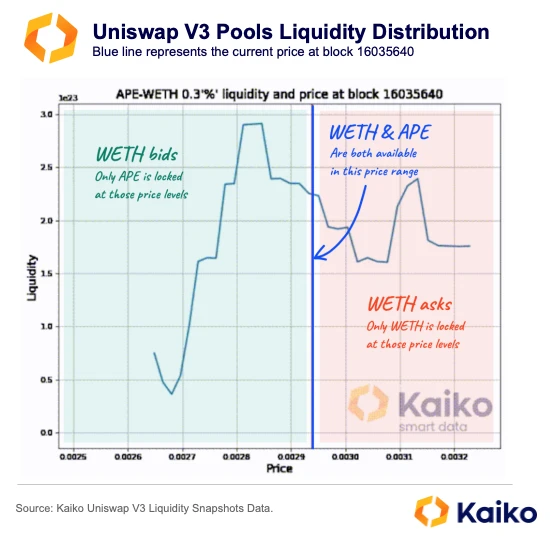 大多数 DEX 不使用订单簿,而是使用自动做市商(AMM)。AMM 通过评估各个流动性池在不同价格水平上的每项资产的数量来确定资产价格。这些池从流动性提供商(LP)那里获取代币,允许交易者直接交易这些资产。尽管大多数基于 AMM 的 DEX 不使用订单簿,但某些流动性池(如 Uniswap V3),特别依赖于我们称之为集中产品 AMM,可以被建模为订单簿,因为 LP 会在某些价格区间内存放代币。我们可以在下面的 wETH-APE 0.3% 费用池中看到一个例子。