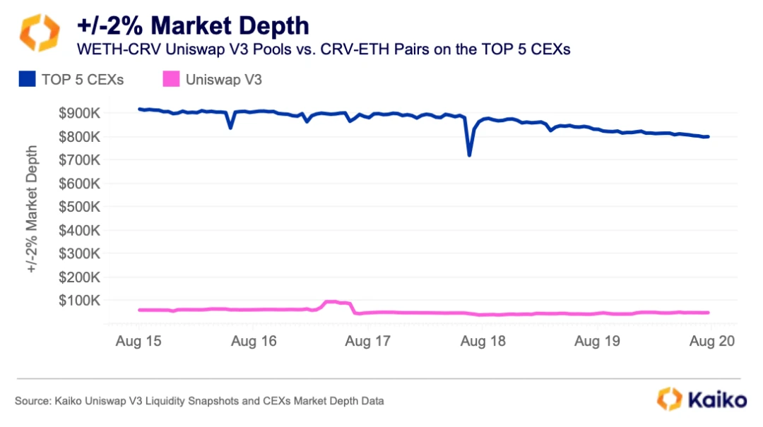 令人惊讶的是,对于像 CRV 这样的小型代币,与提供 CRV-(w)ETH 市场的前 5 个最具流动性的 CEX 相比,Uniswap 的流动性较低。