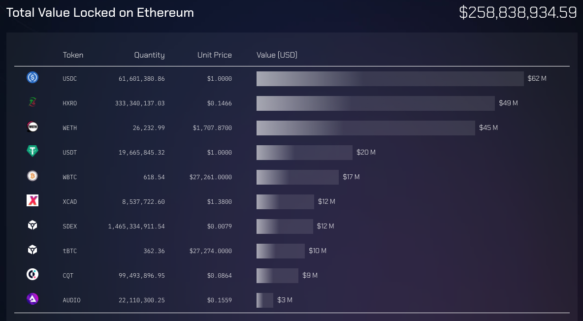 细分到每一条链上,锁定的底层资产最高的链分别为以太坊 2.59 亿美元,Solana 2300 万美元,BNB 链 1600 万美元,Terra Classic 800 万美元,Near 800 万美元。以太坊上锁定价值较高的资产分别为 USDC 6200 万美元,HXRO 4900 万美元,WETH 4500 万美元,USDT 2000 万美元,WBTC 1700 万美元。绝大多数都为主流币,相对比较真实。