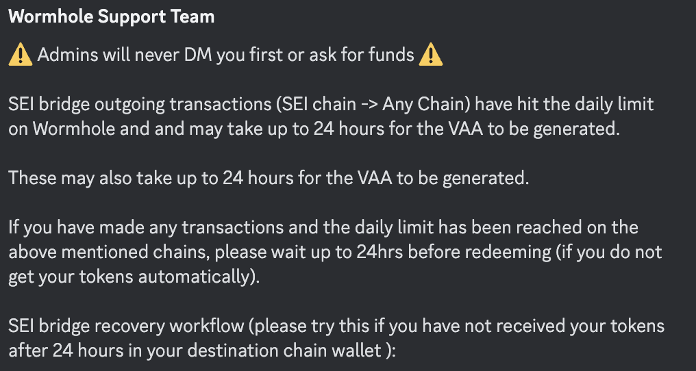 在 Wormhole 社群中,关于已达到跨链金额上限的提醒时有发生,如下图所示。对于跨链协议,资金的到账速度也是一个重要的评价指标,通常情况下 Wormhole 制定的每日上限已经能满足需求,且到账速度很快。但由于 Sei 的空投规则引起的跨链需求激增,退出需等待 24 小时的体验较差。