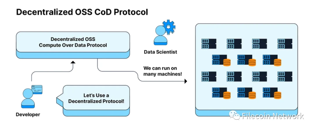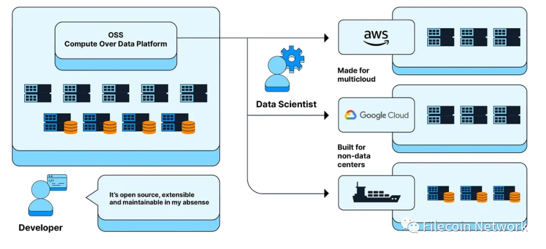 通过在 Filecoin 网络等分布式协议上进行部署,我们的愿景是用户可以访问同一网络上分布在不同地区的数百(或数千台)机器,并遵循与其他机器相同的协议规则。这本质上为数据科学家打开了一个充满选择的海洋,因为他们可以请求网络: