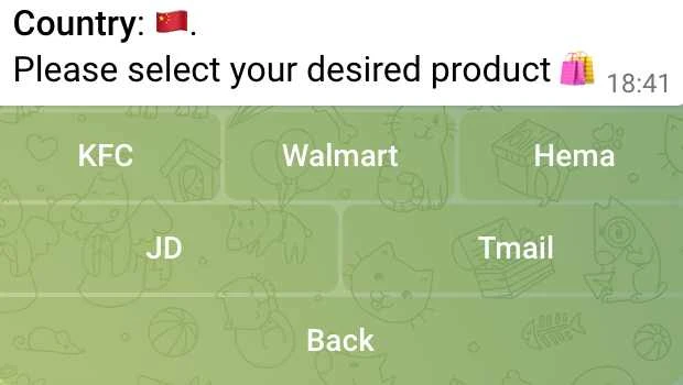 具体使用方法是进入 Bot 后,点击开始,选择国家后就可以看到具体的购物项目,有 KFC、沃尔玛、京东等平台的接口可供选择。选择礼品卡的金额后就会跳出来支付方式和付款地址。付完款以后,确认交易,Bot 就会发来礼品卡的卡号和密码,之后就可以在对应平台使用刚才购买的礼品卡。