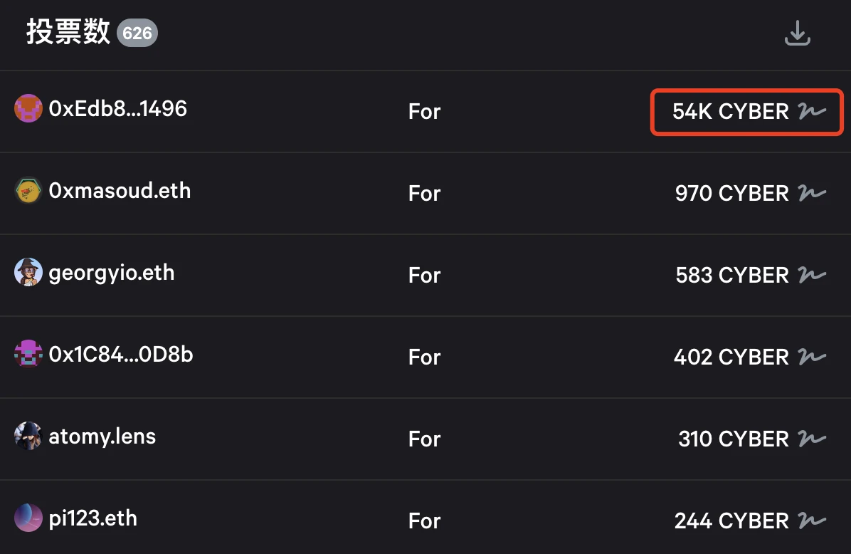 一个名为“cybergov.eth”(cyber 治理)的用户,发起了一场有效期仅 12 小时 的投票。仅 一名用户 就投出了占总投票量 87% 的表决票。