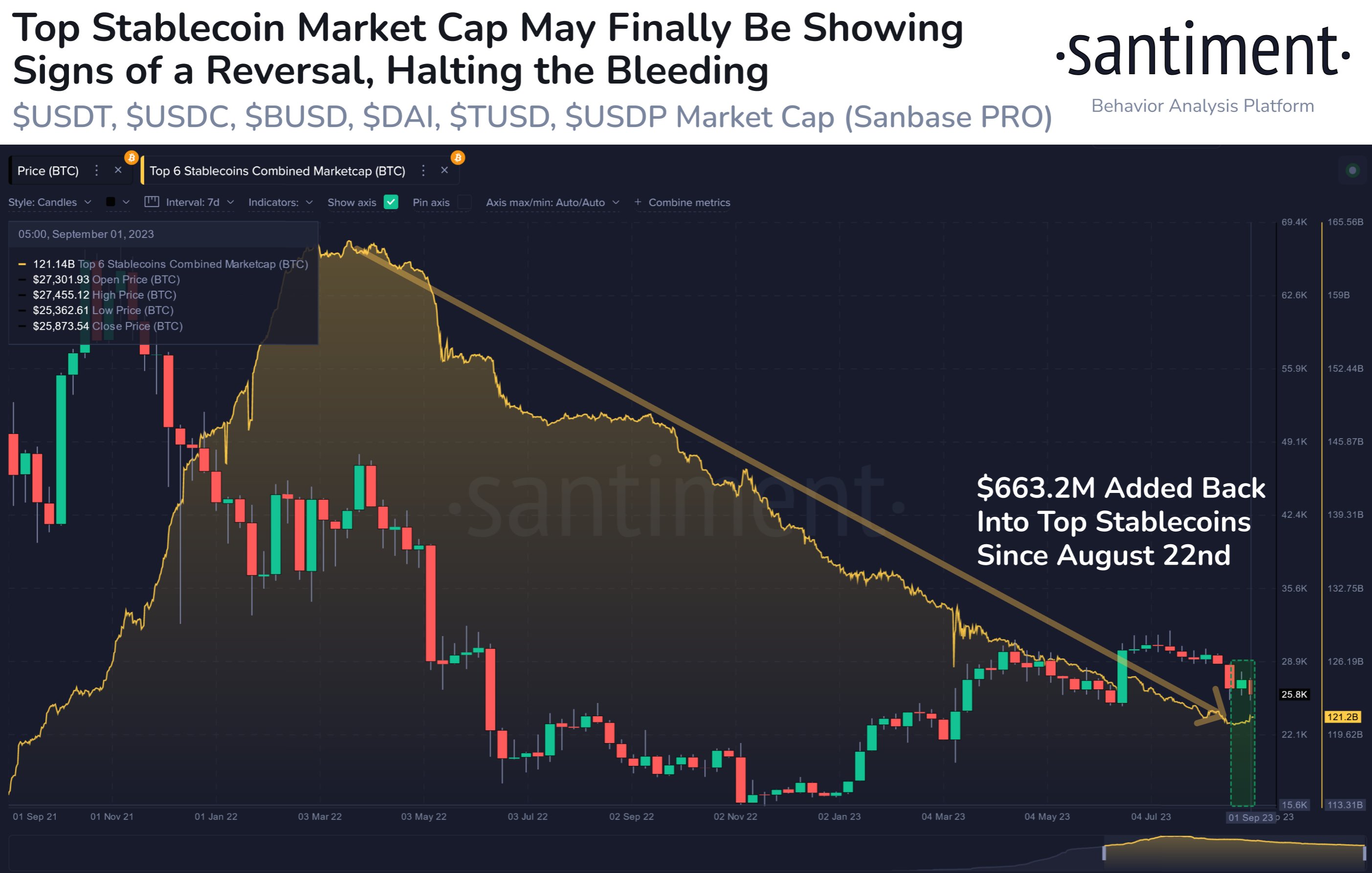 博链财经BroadChain获悉,9月3日,Santiment数据显示,自8月22日以来, USDT 、USDC、BUSD、DAI、TUSD和USDP六大稳定币的总市值增长6.632亿美元,自2022年11月FTX崩盘以来首次出现增长。