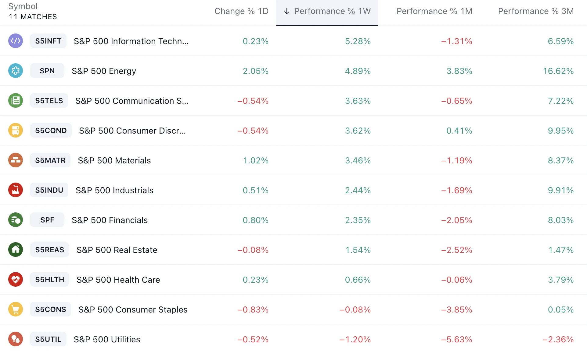 标普 500 行业指数表现明显偏向进取,科技、能源最强,公用事业、消费必需品最弱: