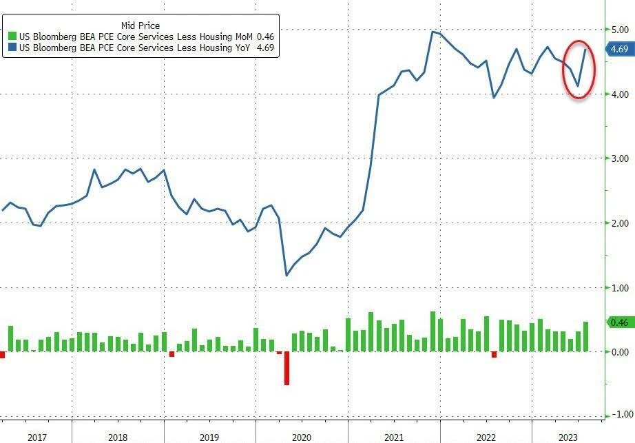 值得注意的是,更受关注的是美联储对去除住房的服务业通胀的看法,而对应的 PCE 物价指数显示,服务业通胀在很大程度上停留在高位: