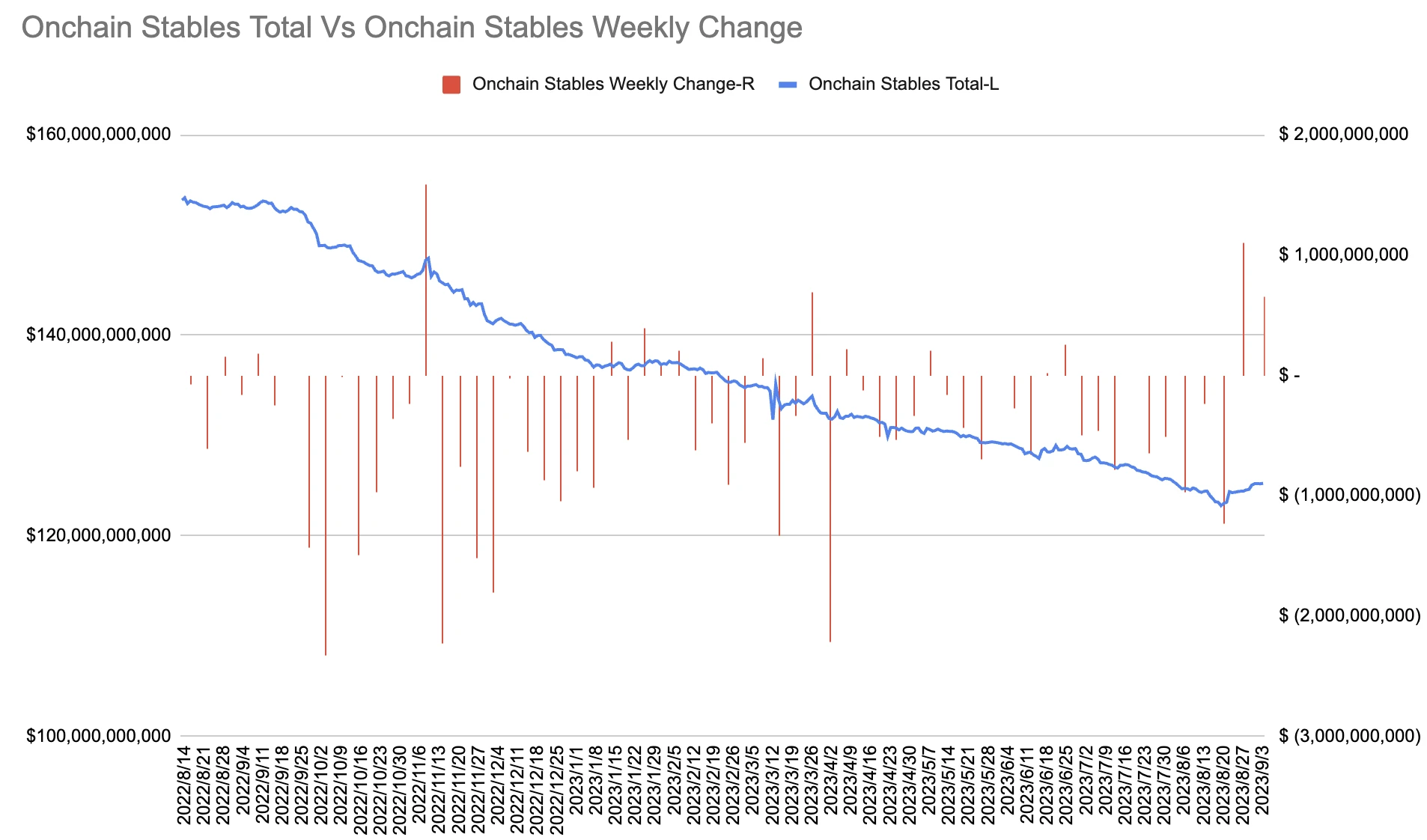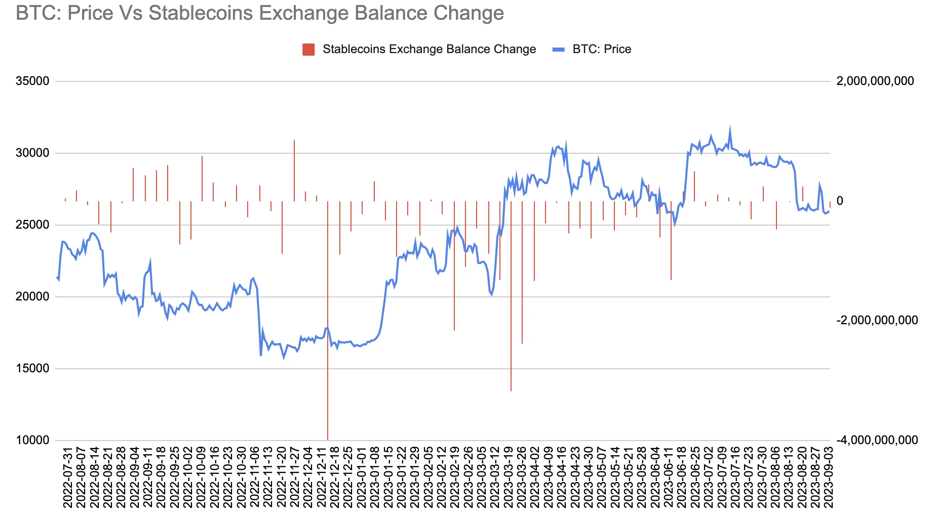交易所内稳定币余额连续第二周下降(-1.18 亿美元),为四周来最大流出: