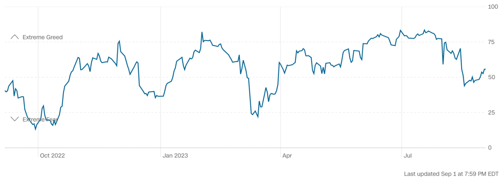 CNN 恐惧贪婪指数从 48 回升至 56 进入积极区间: