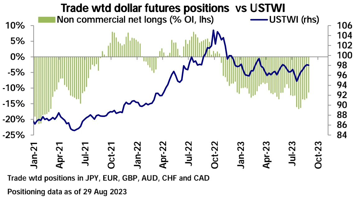 整个八月美元汇率强势反弹,美元指数 DXY 8 月上涨约 2.2% ,在 8 月 25 日鲍威尔在杰克逊霍尔发表讲话时达到峰值,在 8 月最后一周回落,结束了四周的上涨。美元的走势跟市场利率的走势高度相关,两年期收益率上周接近年内最高点,一度超过 5.1% ,但在 8 月最后三天暴跌超过 25 个基点,配合期货市场的定价变化,证实市场几乎完全放弃了 9 月加息的可能性,主要是 8 月就业市场数据(以 JOLTS 为首)带来的波动。