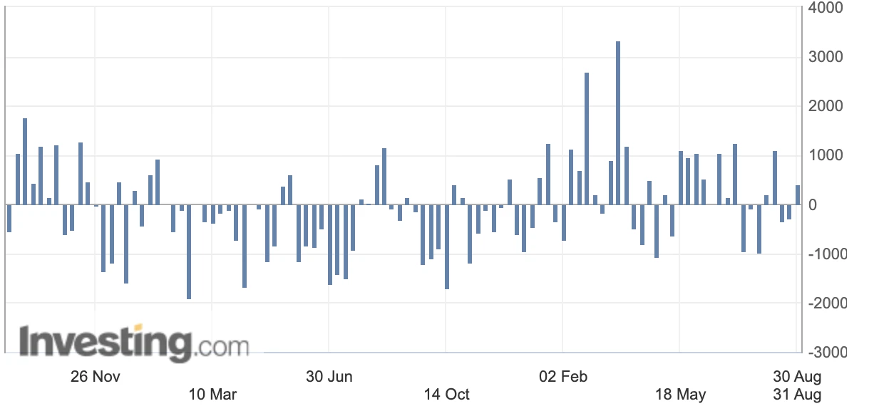 也有人认为日本 7 月末调整收益率曲线控制对 8 月初全球债券抛售负有责任。然而,财务省每周投资组合流动性报告显示,日本投资者一直在购买外国债券。事实上,自去年 12 月 10 年期日本政府债券收益率上限从 0.25% 翻倍至 0.50% 以来他们大部分时候是外国债券的净买方。下图是过去两年间日本投资者周度外国债券净流动数据(单位:十亿日元):