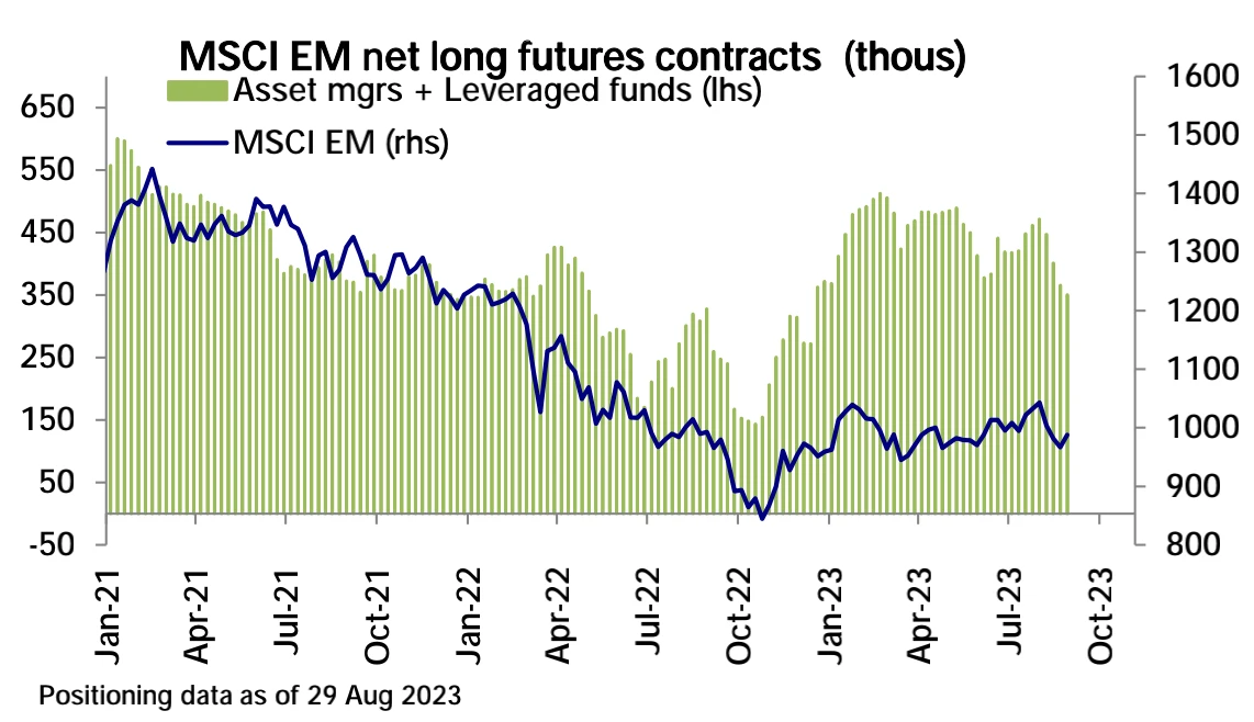 CFTC 数据显示,上周美国股市的整体净多头持平,这主要是由于 S&P 500 的净多头减少被 Nasdaq 100 的净多头增加所抵消,同时,Russell 2000、和 DJIA 的净空头也有所减少。在美国之外,新兴市场的多头头寸有所减少,这可能反映了投资者对新兴市场的谨慎态度。