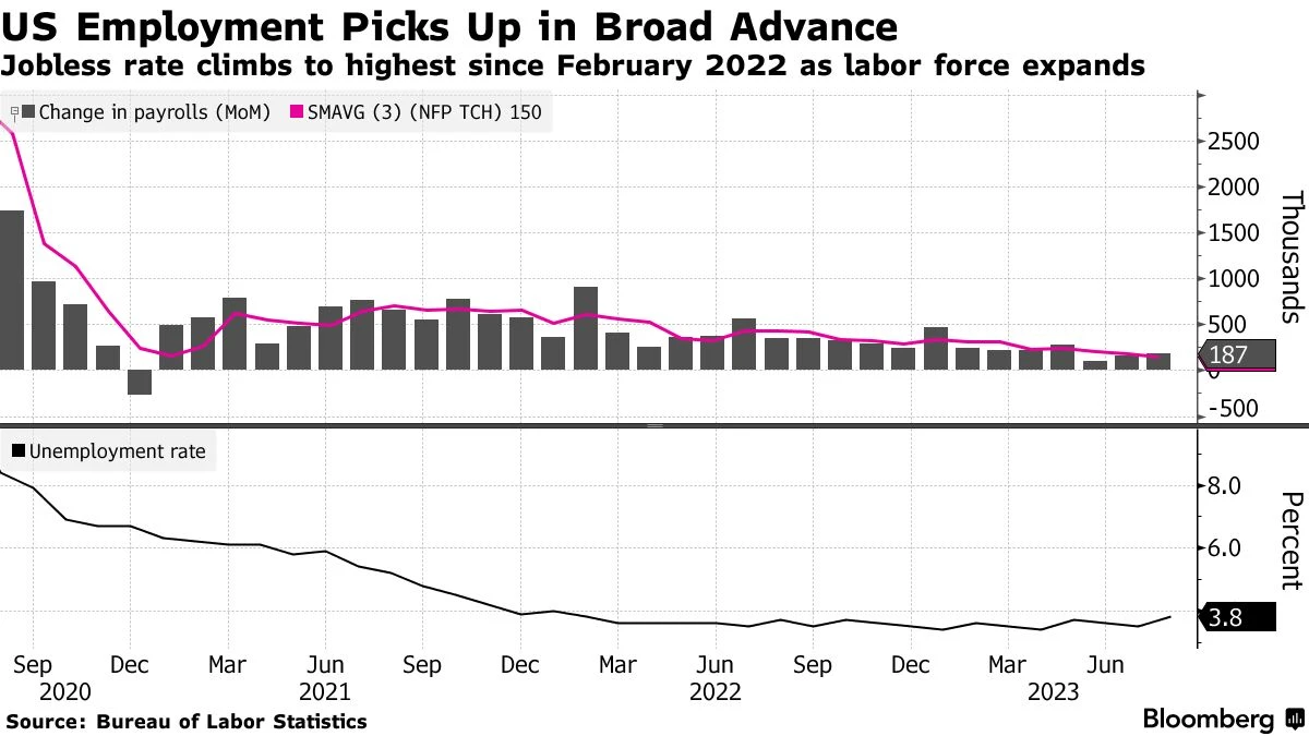 周二的 JOLTS 职位空缺降至 2 年来最低水平,和周五的非农就业报告显示失业率上升。市场参与者对这些数据感到振奋,这些数据表明过热的劳动力市场终于开始显现出疲态,美联储激进的紧缩行动的效果正在显现,市场希望这些报告足以说服 Fed 停止加息(但唱反调但是初请失业金人数连续第三周下降)。