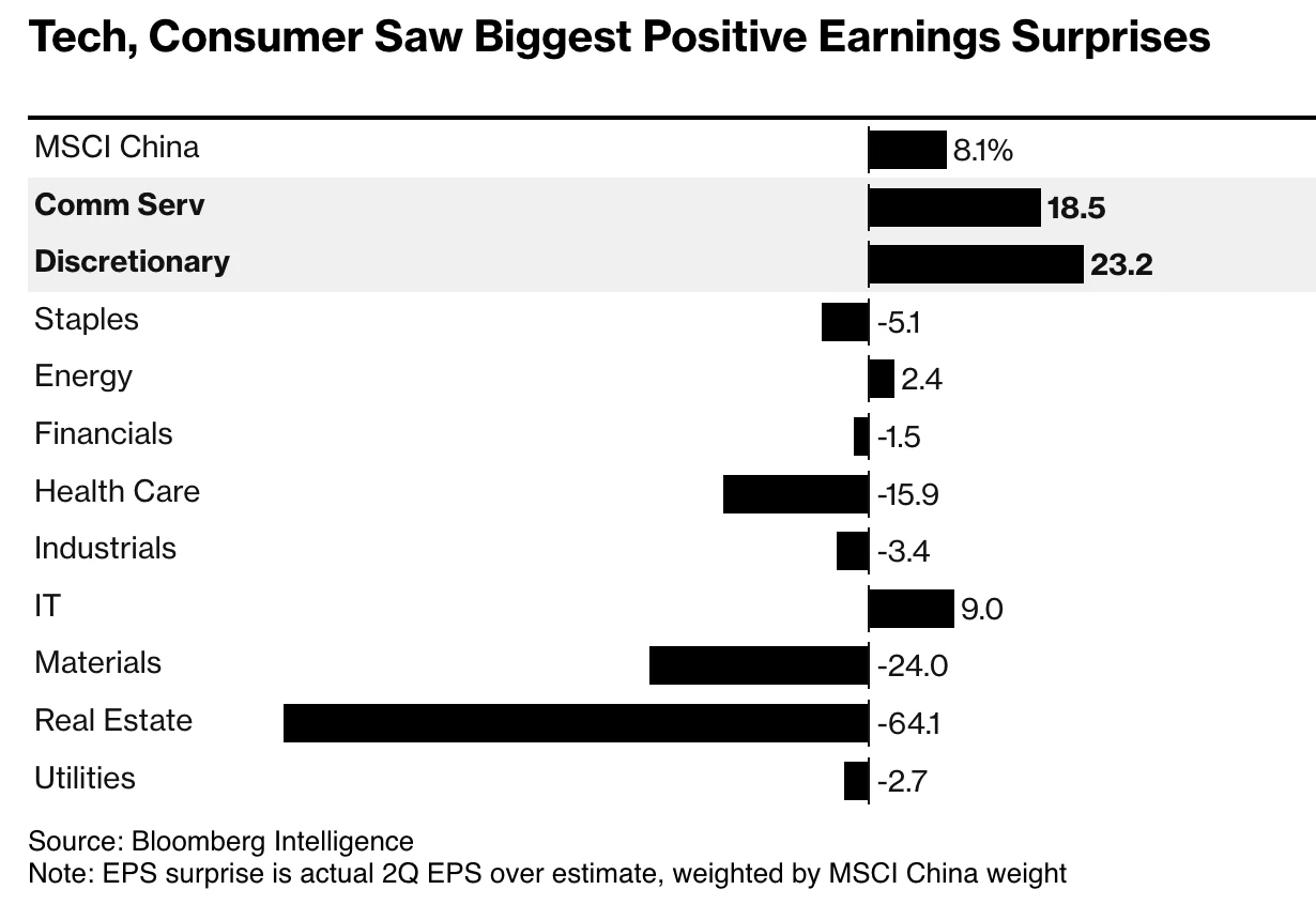 除了 7 月已经触底的房地产板块,中国的科技和消费股在财报季中表现突出,并呈现出一些韧性。