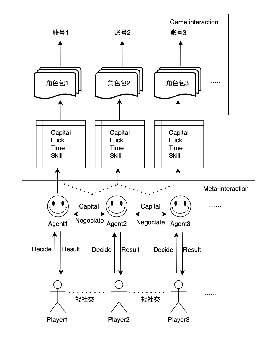 现在 AI 已经有了竞拍/议价的功能,那么整个经济交互系统中,如果由 AI 来代替人掌管游戏内交互,以及游戏外与其他玩家的交互;而每个玩家都有一个 agent,这些 agent 可以与其他 agents 的通信,共同协商条件/议价,这不是很好玩吗?