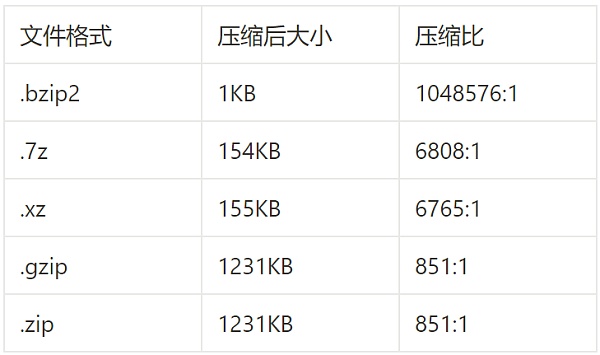我们继续这个实验,在Windows上用7zip将1GB的内容全是0的大文件,压缩为不同的格式。这样我们得出下面的压缩比列表: