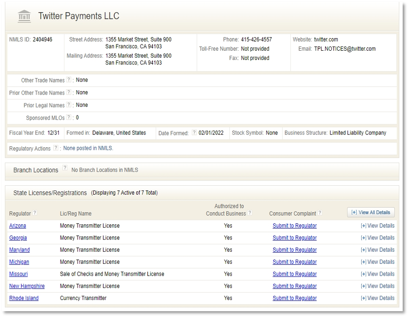 北京时间8月29日晚,X支付分公司Twitter Payments LLC在美国罗得岛州获得货币转账许可“Currency Transmitter”。