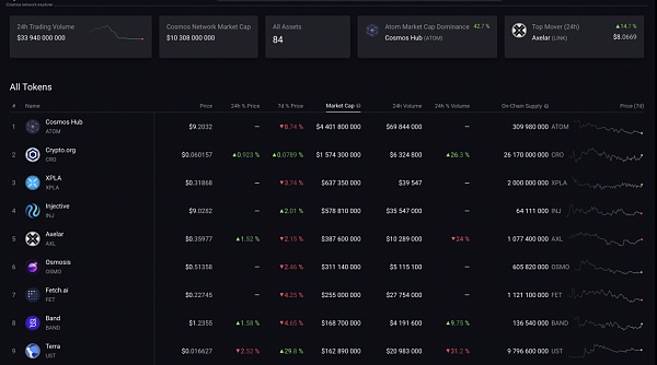 据 mapofzones.com 统计,截至今年 7 月 21 日,Cosmos Network Market Cap(Cosmos 生态项目市值总和) 为 103 亿美元,ATOM 成为生态中市值最高的 Token,ATOM Market Cap Dominance(ATOM 市值占比)为 42.7 %。