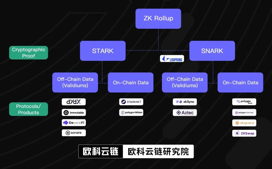 ZK Rollup是基于ZK技术落实Rollup的L2解决方案,项目间的主要差异就在于采用的ZK技术不同。目前市面上主流的ZK技术包括三类,分别是zk-SNARKs、zk-STARKs以及Bulletproofs。其中,zk-SNARKs和zk-STARKs在ZK Rollup扩容方案中都有所应用(注:Bulletproof曾被用于隐私币的设计当中)。