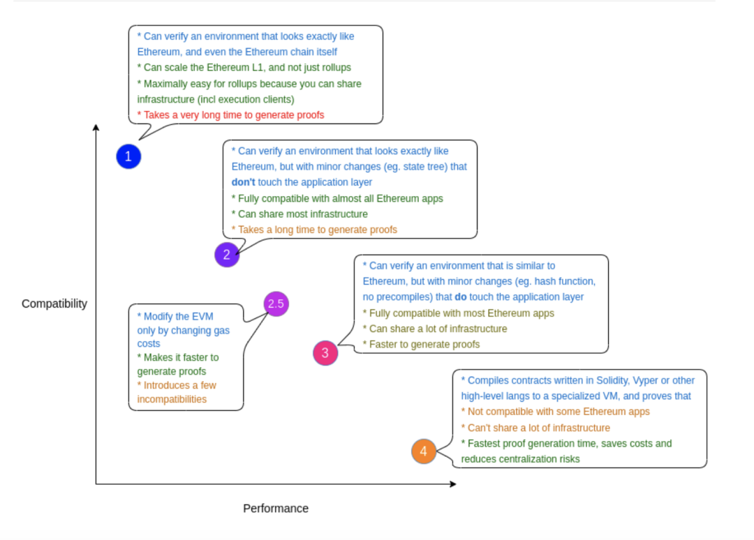 根据改造程度和EVM兼容程度,Vitalik将目前的ZK Rollups分为以下等级: