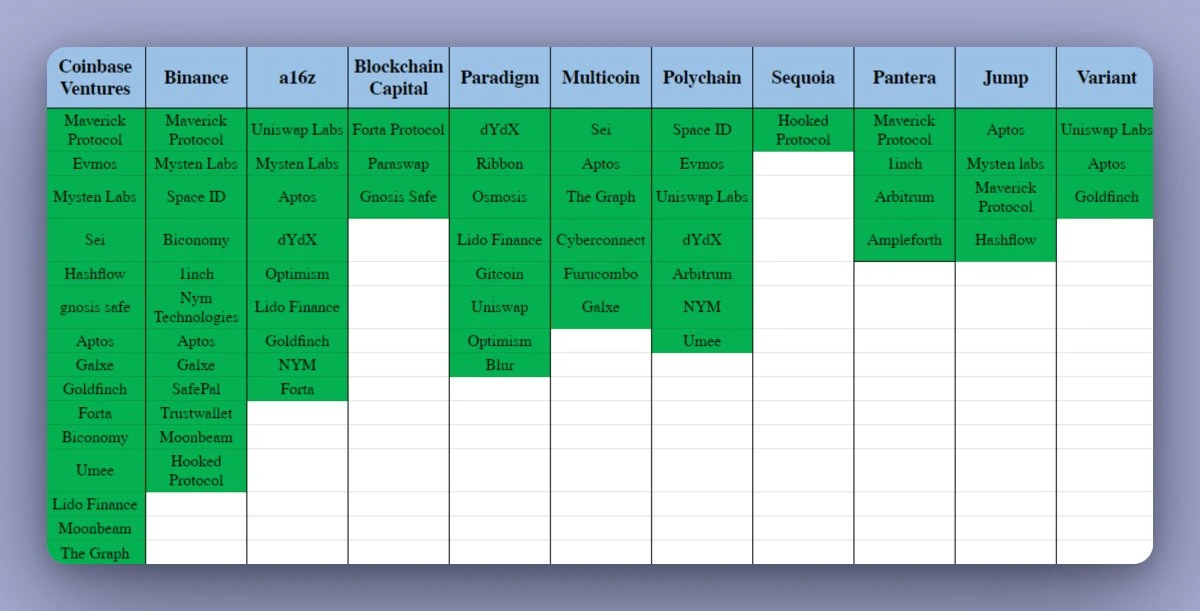我选择了 11 家业界知名 VC,并创建了一个数据库。之后,我对这些 VC 近些年已披露的所有投资进行了一轮大规模的整理,并筛选出了其中已空投的项目。