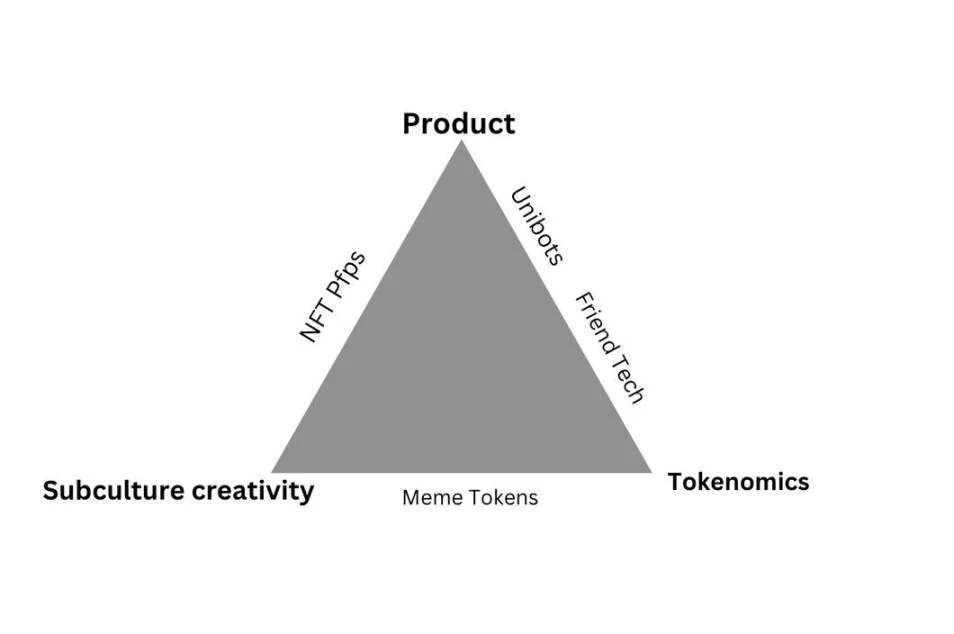 如果我们将产品力、亚文化创造力和好的 token 模型三点视为一个三角形(你们币圈最喜欢三各种三角形比喻),成功的项目通常要拥有其中至少两个,一个项目要能获客并且和长期生存,同时具备三个元素是必要的。