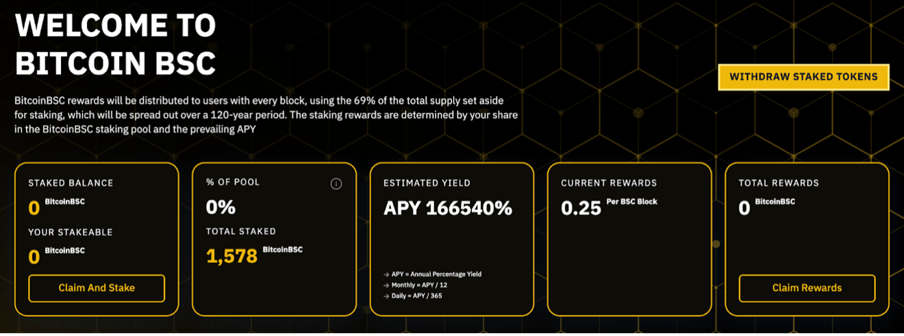 Bitcoin BSC的质押功能已经开始运行,甚至在代币在去中心化交易所PancakeSwap上市之前。
