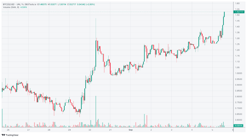 实际上,BTC20曾经在一天内创下了6美元的历史最高(ATH)价位,相当于其1美元的预售和上市价格的688%的7倍增长。