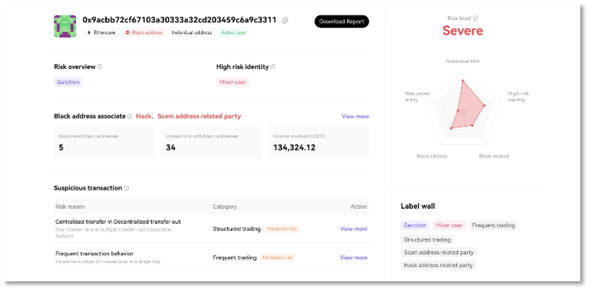 KYT更像是一种主动出击,它聚焦于交易过程,配合地址数据,能实时监测每笔链上交易是否可能存在钓鱼、欺诈、盗窃等风险,而且在监测到风险时,还能自动采取措施隔断风险。
