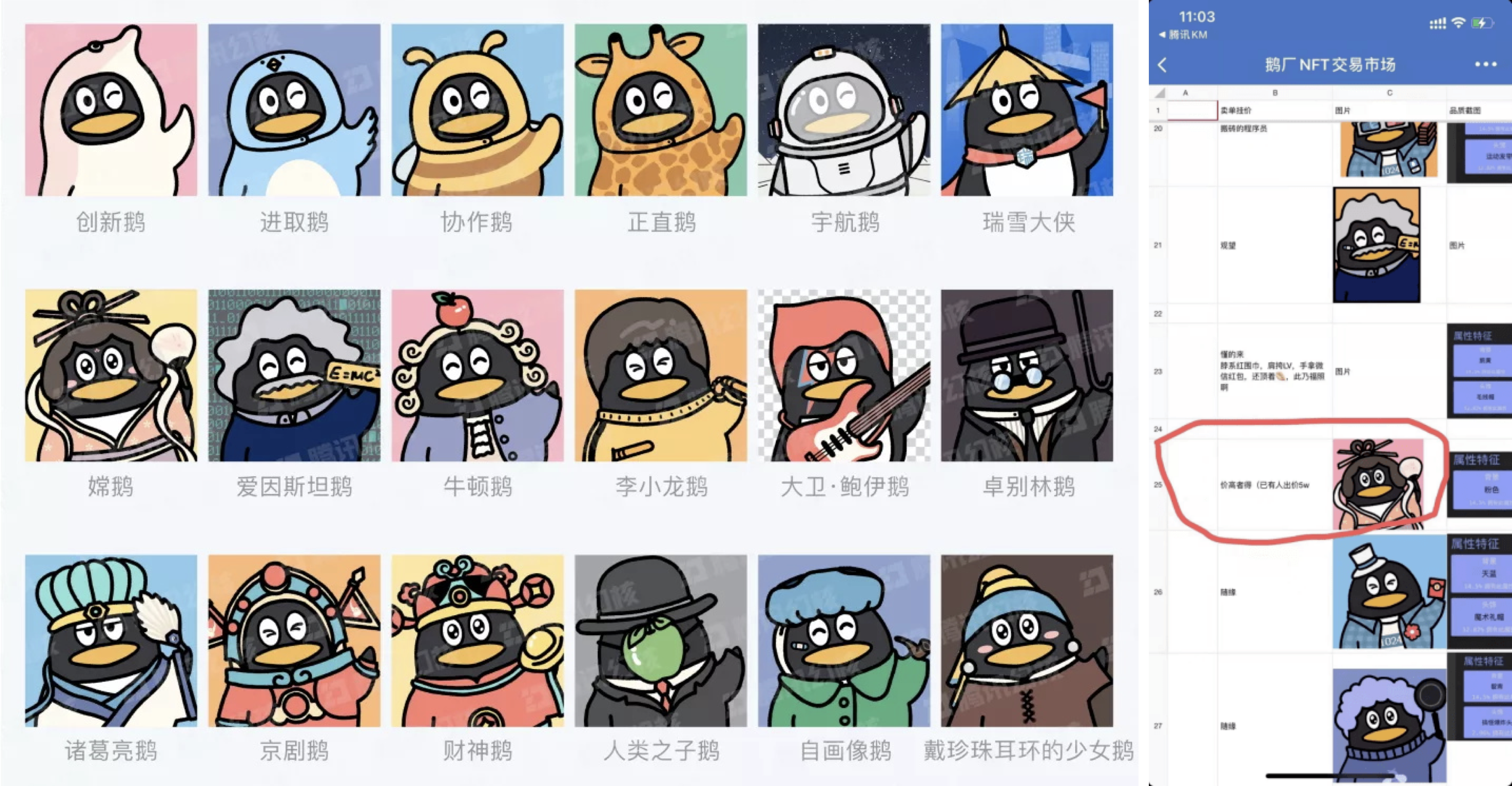 该系列 NFT 由 PCG 孵化的幻核团队制作,以 QQ 企鹅形象为基础进行 IP 衍化,共 72000 枚,共囊括 58 个元素,按出现概率分为优质、稀有、史诗三个等级,其中另有 1000 枚特殊彩蛋造型。NFT 系列发行后,迅速在公司内部掀起一股「交易热潮」,甚至还有人用表格软件搭建了一个简陋的「交易市场」。当时受欢迎的「嫦鹅」隐藏款,曾拍出 5 万高价,「买卖企鹅」成了腾讯内部的社交新潮流。