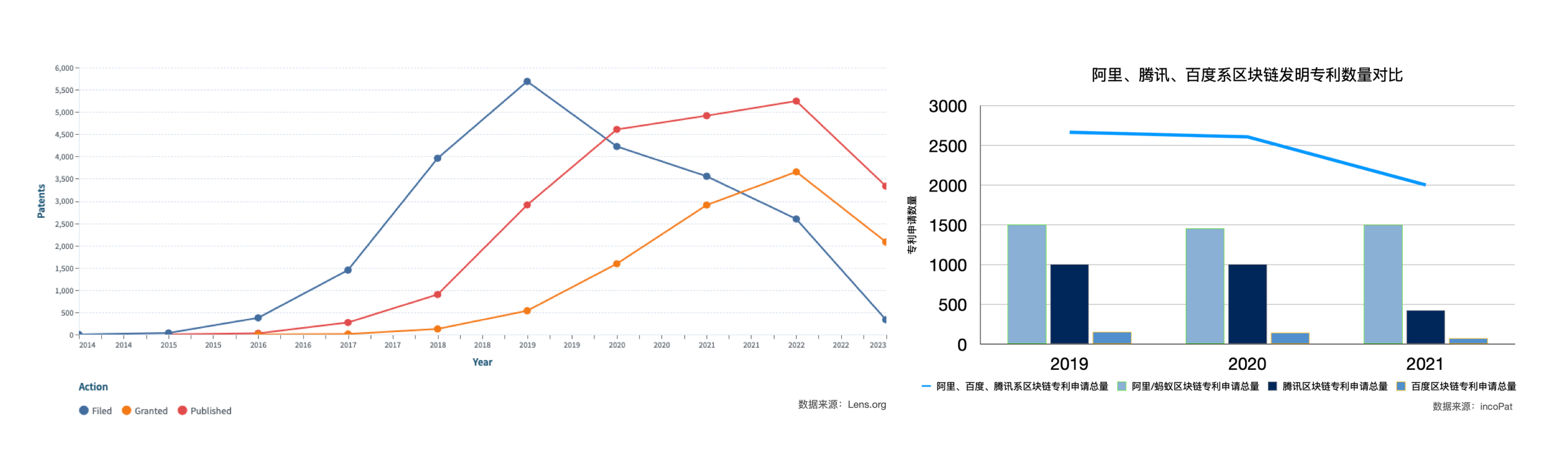 左图为全球区块链专利申请趋势,右图为阿里、腾讯、百度区块链专利申请趋势
