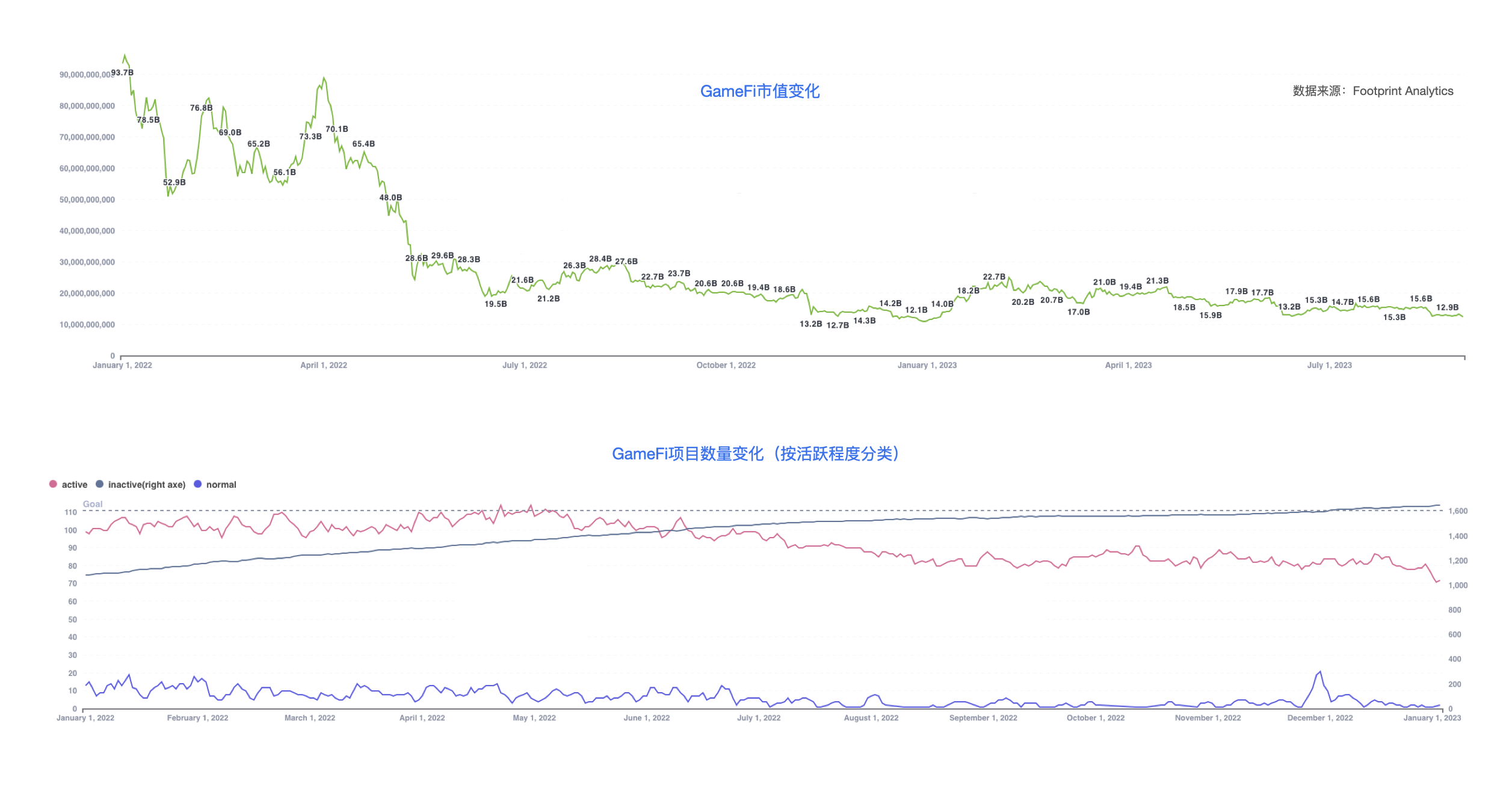 根据 Footprint Analytics 数据显示,当前 GameFi 赛道的市值已从 2022 年初的 937 亿美元缩水至 133 亿美元。从 GameFi 项目的数量上看,目前仍然活跃的项目仅有不到 80 个,而非活跃项目则超过了 1600 个,且二者间的剪刀差仍在不断扩大。