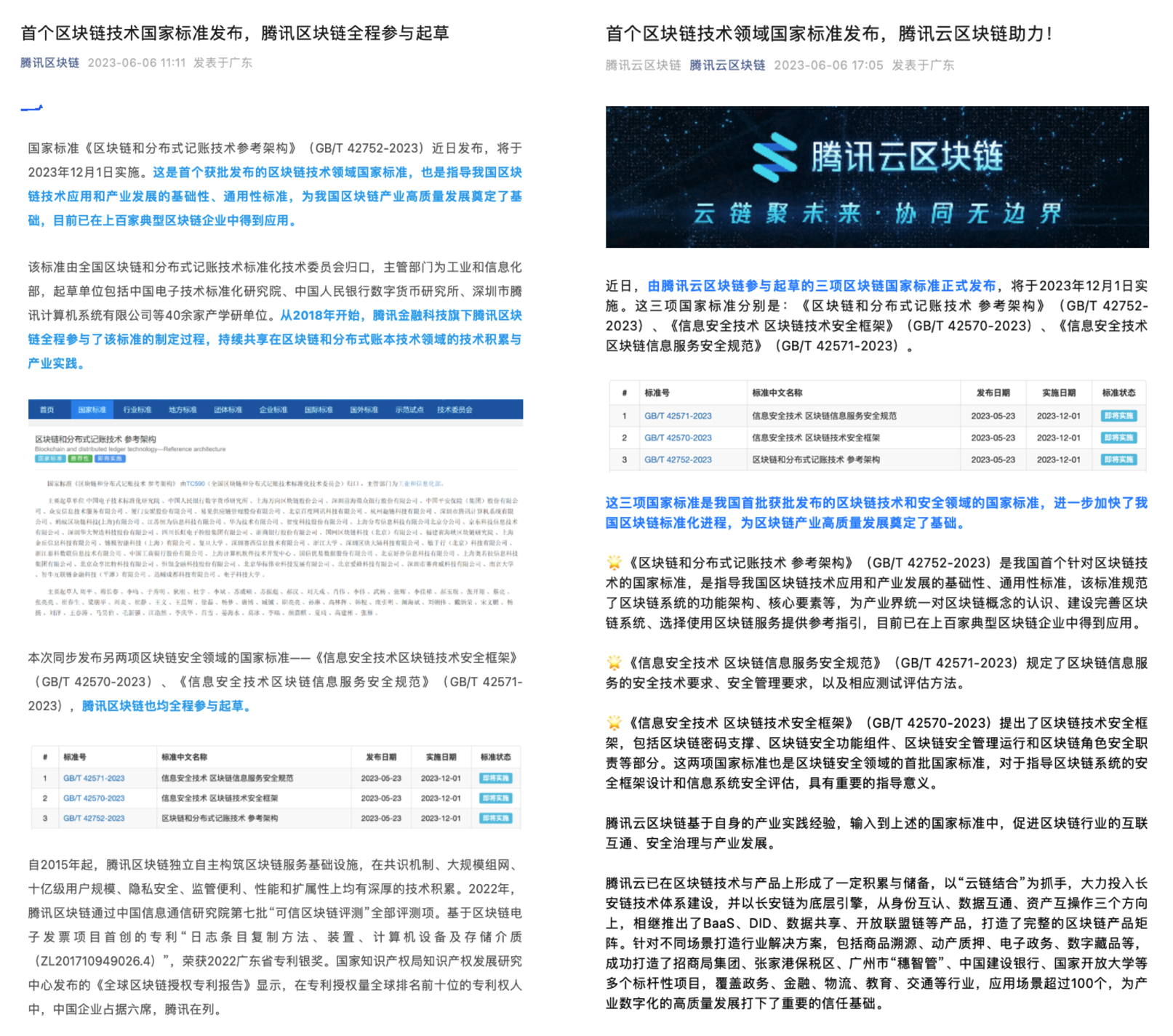 腾讯系区块链业务的组织结构则显得杂乱无章。先是有微众银行主导的金链盟,后来又有腾讯区块链和腾讯云区块链,且每个业务线都在底层技术和顶层应用上有自己的研发,将腾讯一贯的「赛马机制」发挥得淋漓尽致。自 2022 年以来,腾讯在区块链领域的业务几乎没有任何重大进展。有意思的是,在今年 6 月,首个区块链技术国家标准发布,腾讯区块链和腾讯云区块链都在第一时间分别发表公众号文章,表示参与起草了该项国家标准。