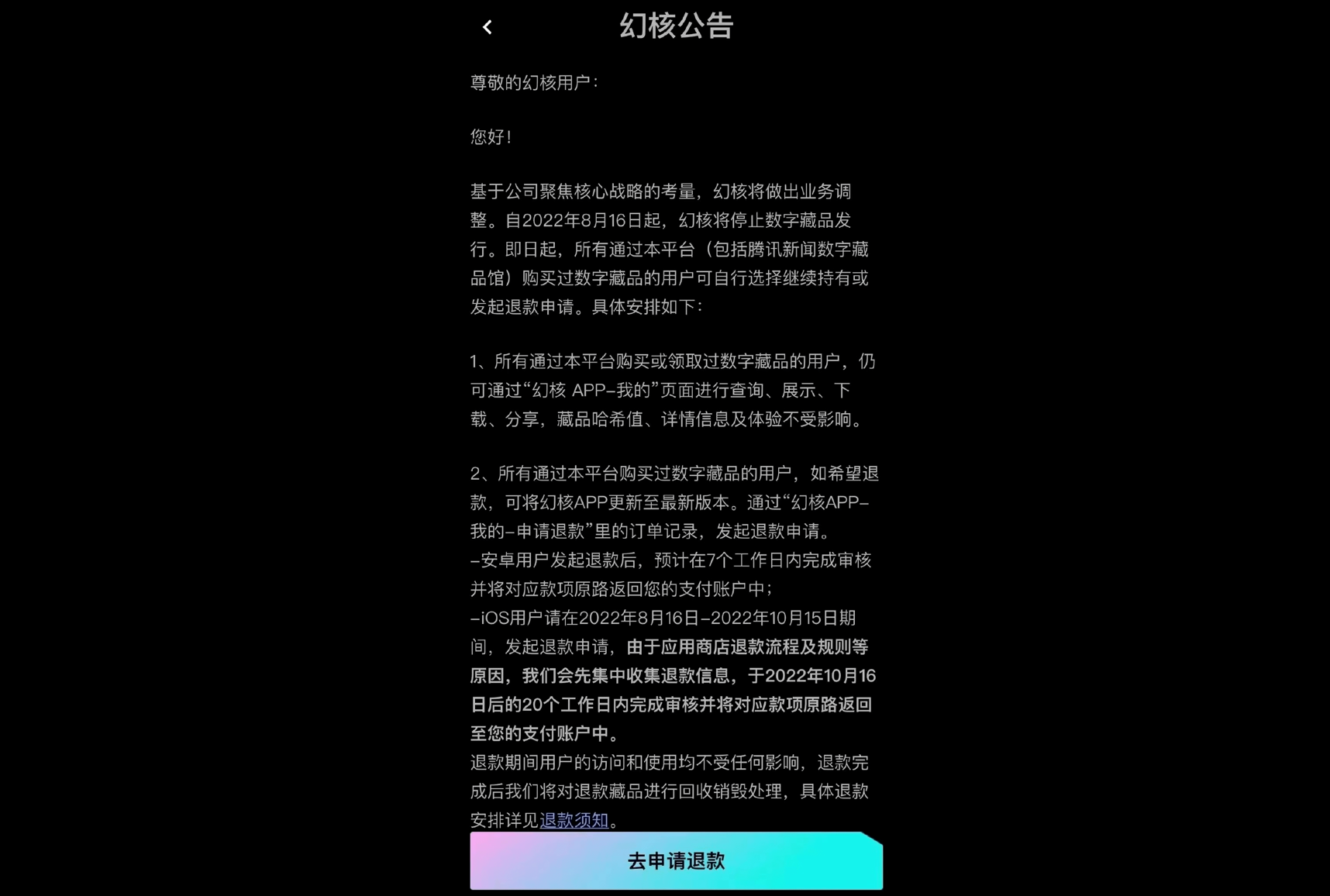 2022 年 5 月,原腾讯新闻总经理王诗沐突然调任 PCG 社交平台与应用业务线,负责幻核等创新业务。紧接着在 8 月,幻核便发布公告停止数字藏品发行并提醒用户发起退款申请。9 月,王诗沐离职。次年 3 月,幻核正式发布下线通告。