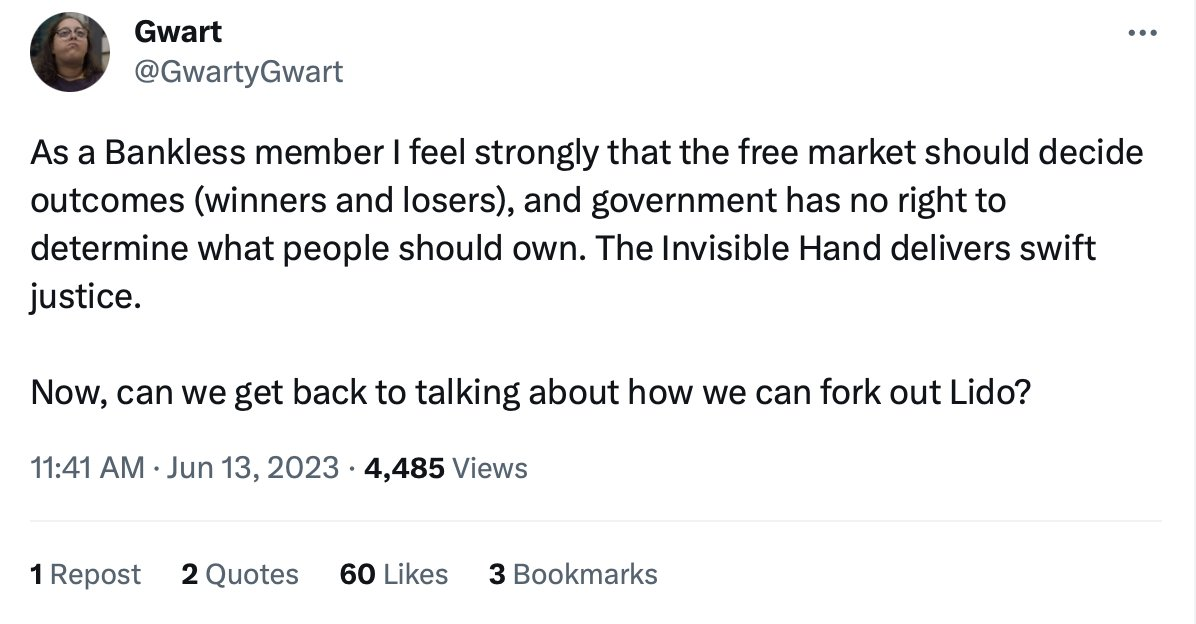 如果 Lido 不遵从少数核心开发者、研究人员、意见领袖的意愿,威胁要限制或分叉 Lido,这将是扼杀更好、更安全产权观念的最确切的方法。