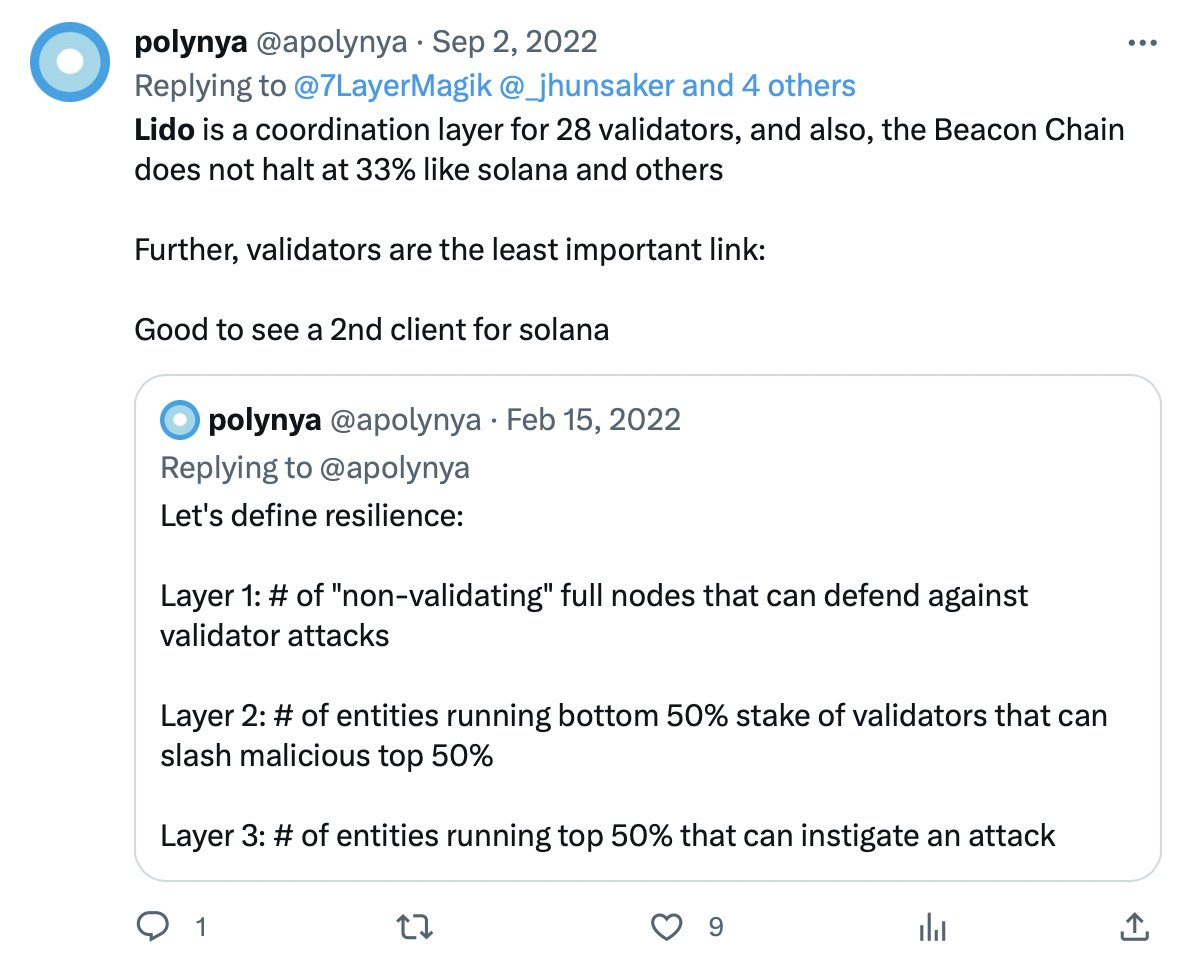 在我看来,Lido 无上限的主导地位最现实的最坏情况,并非网络中断,而是在企业和政府之间树立起一种声誉,认为以太坊是「被控制」或「相对于其他链条,其实并没有那么去中心化」。