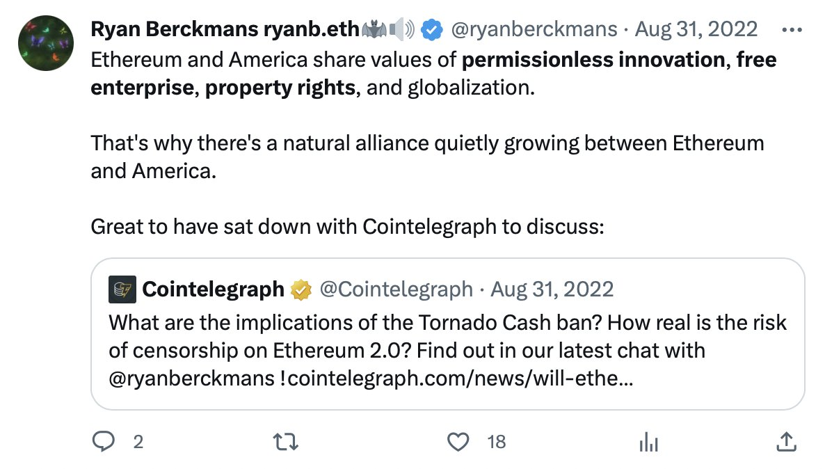 无论如何,在我看来,这样的结果无疑会让人们对以太坊作为自由企业和无需许可的创新之家的能力产生很大的质疑(这些都是 Ryan 和我非常珍视的价值观)。