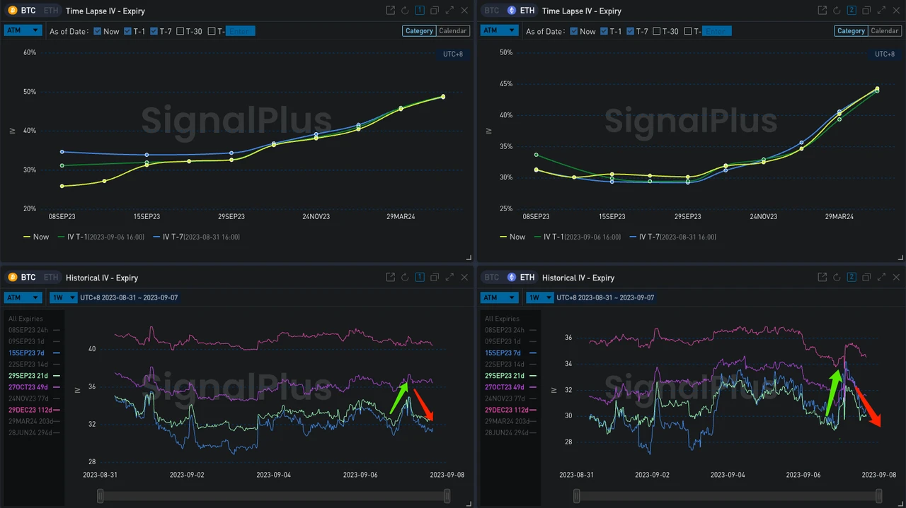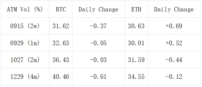 今日凌晨(7 Sep 01: 00 ~ 03: 00 UTC+ 8)数字货币市场出现了一次震荡行情,BTC 小幅下跌至 25326 以后快速反弹突破 26000 阻力位,随后一波卖压又将价格重新打回 25750 附近整盘,最大振幅接近 3% 。在此动荡期间,BTC/ETH 的隐含波动率均出现小幅上扬(月底 IV 上涨 2.5 ~ 3% ),当价格稳定之后 IV 也随即回落。截止今日交割,BTC IV 未发生显著变化;ETH 近期 IV 增长 0.5% Vol 左右,中远端小幅下滑 0.1 ~ 0.5% 。
