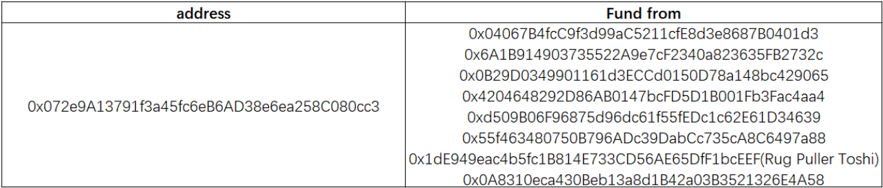 地址0x 072 e 9 A 13 的资金来源如下:地址0x 1 dE 949 ea 存在部分资金交互。其他地址也创建了工厂代币合约,并且是一些代币的 Rug Puller。