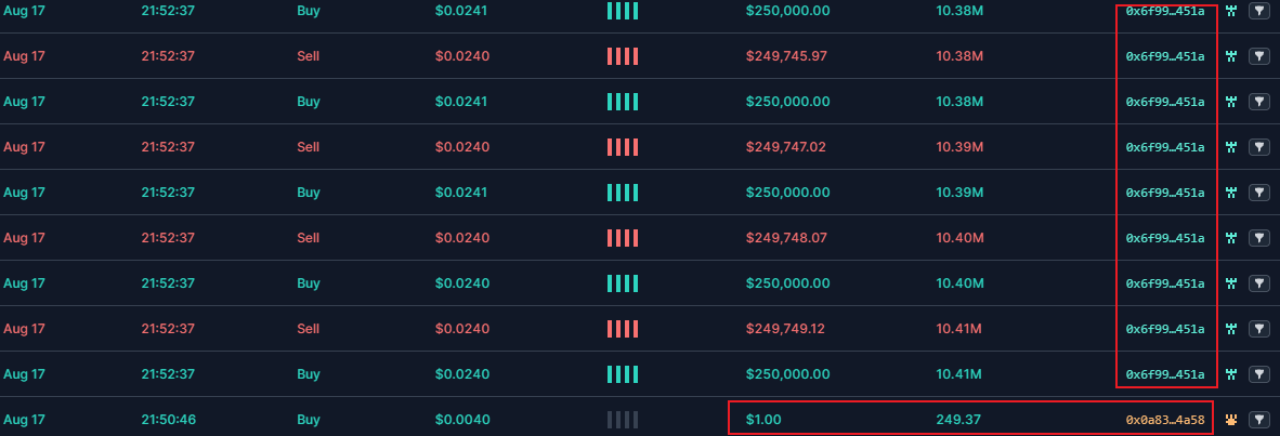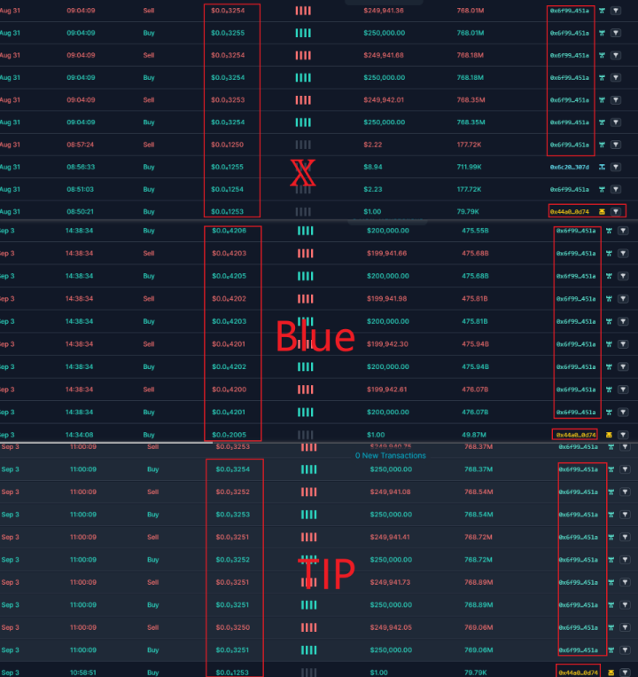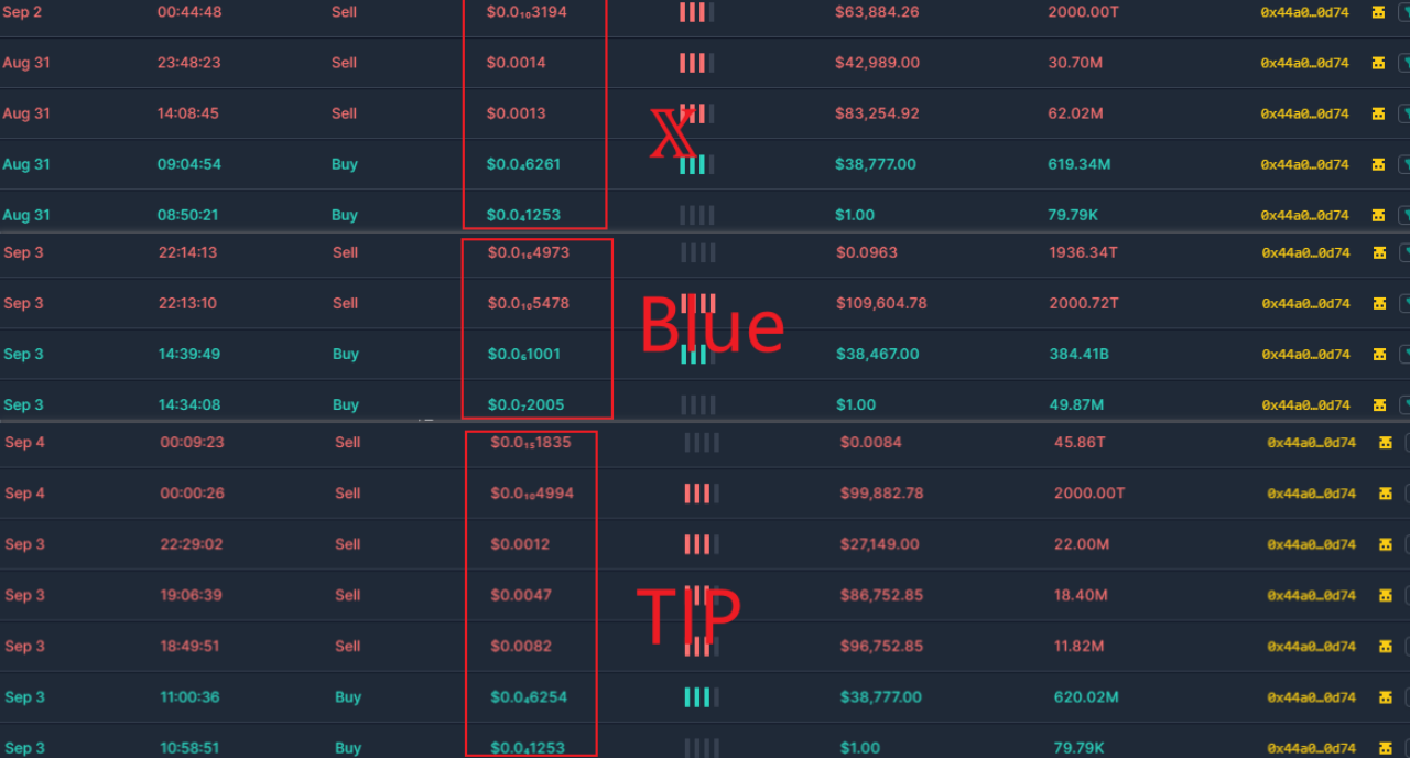 首先 X、TIP 和 Blue 代币所有者 0x44A028Dae3680697795A8d50960c8C155cBc0D74 用 1u 兑换了相应的代币。然后,和 Sei 代币一样。0x 6 f 9963448071 b 88 FB 23 Fd 9971 d 24 A 87 e 5244451 A 批量的买入和卖出操作。在买入和卖出操作下,流动性明显增加,价格上涨。